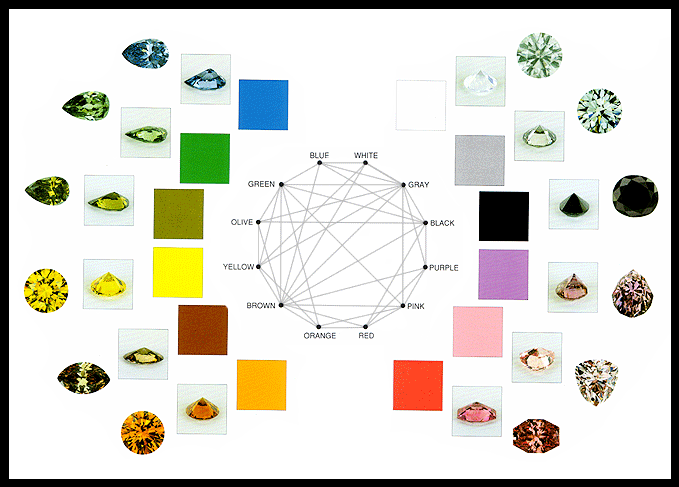 Diamond Color Variety Chart12 color varieties of natural color diamonds and their modifiers ![]() As seen in "Collecting and Classifying Coloured Diamonds - An Illustrated Study of the Aurora Collection" and "Forever Brilliant: The Aurora Collection of Colored Diamonds" |